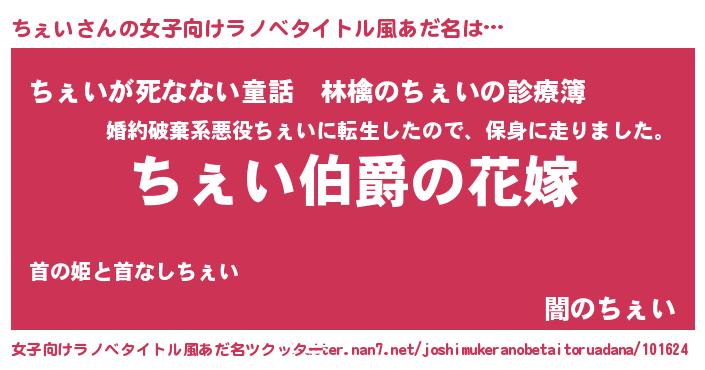 | 男性向けラノベタイトル風あだ名 | 『やはりちぇいの青春ラブコメはまちがっている 』 |