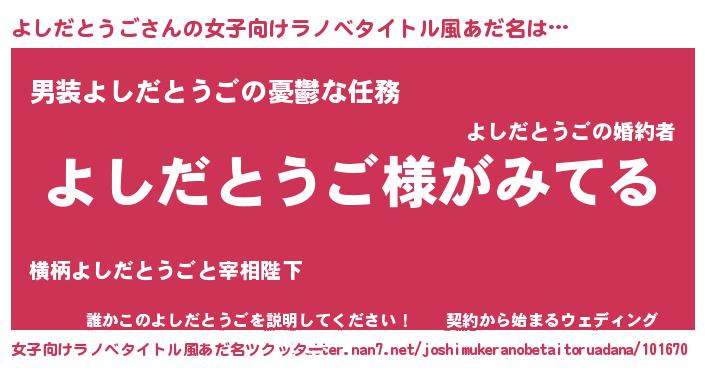 | 男性向けラノベタイトル風あだ名 | 『よしだとうごの嫁は女の子じゃないと思った?』 |