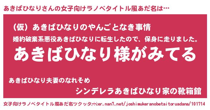 | 男性向けラノベタイトル風あだ名 | 『あきばひなりの嫁は女の子じゃないと思った?』 |