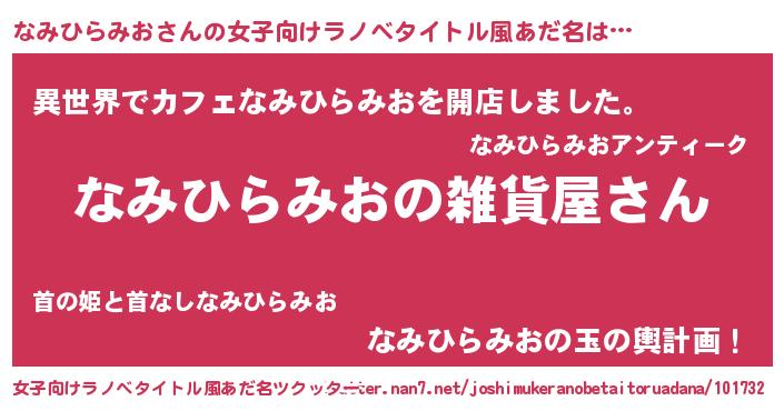 なみひらみおさんの女子向けラノベタイトル風あだ名は… 『なみひらみおの雑貨屋さん』『異世界でカフェなみひらみおを開店しました。』『なみひらみおの玉の輿計画!』 ツクッター #女子向けラノベタイトル風あだ名ツクッター http://tkutter.nan7.net/joshimukeranobetaitoruadana/101732/
