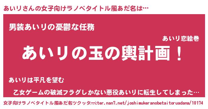 あいリさんの女子向けラノベタイトル風あだ名は… 『あいリの玉の輿計画!』『男装あいリの憂鬱な任務』『乙女ゲームの破滅フラグしかない悪役あいリに転生してしまった…』 ツクッター #女子向けラノベタイトル風あだ名ツクッター http://tkutter.nan7.net/joshimukeranobetaitoruadana/10174/