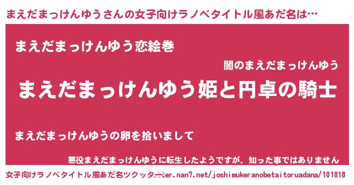 まえだまっけんゆうさんの女子向けラノベタイトル風あだ名は… 『まえだまっけんゆう姫と円卓の騎士』『まえだまっけんゆう恋絵巻』『悪役まえだまっけんゆうに転生したようですが、知った事ではありません』 ツクッター #女子向けラノベタイトル風あだ名ツクッター http://tkutter.nan7.net/joshimukeranobetaitoruadana/101818/