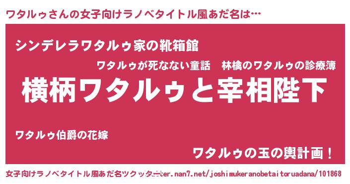 | 男性向けラノベタイトル風あだ名 | 『ワタルゥに滅ぼされるだけの簡単なお仕事です』 |