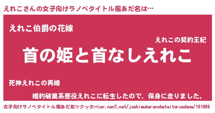 えれこさんの女子向けラノベタイトル風あだ名は… 『首の姫と首なしえれこ』『えれこ伯爵の花嫁』『婚約破棄系悪役えれこに転生したので、保身に走りました。』 ツクッター #女子向けラノベタイトル風あだ名ツクッター http://tkutter.nan7.net/joshimukeranobetaitoruadana/101896/