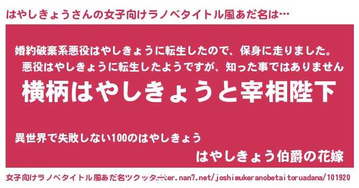 | 男性向けラノベタイトル風あだ名 | 『はやしきょうに滅ぼされるだけの簡単なお仕事です』 |