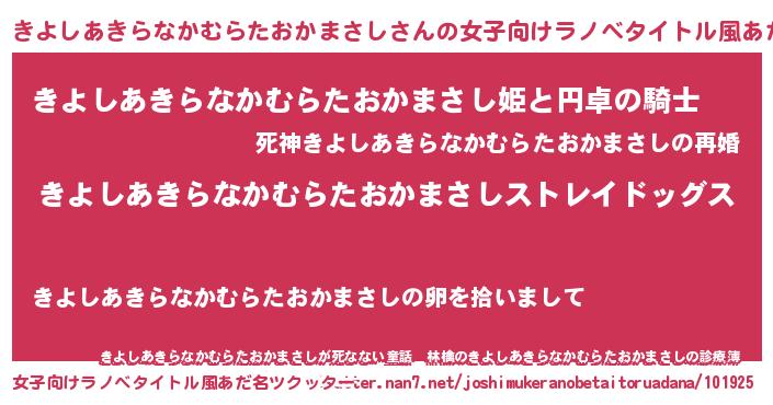 | 男性向けラノベタイトル風あだ名 | 『Re:きよしあきらなかむらたおかまさしから始める異世界生活』 |