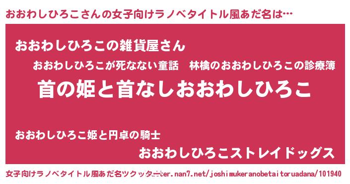 おおわしひろこさんの女子向けラノベタイトル風あだ名は… 『首の姫と首なしおおわしひろこ』『おおわしひろこの雑貨屋さん』『おおわしひろこストレイドッグス』 ツクッター #女子向けラノベタイトル風あだ名ツクッター http://tkutter.nan7.net/joshimukeranobetaitoruadana/101940/