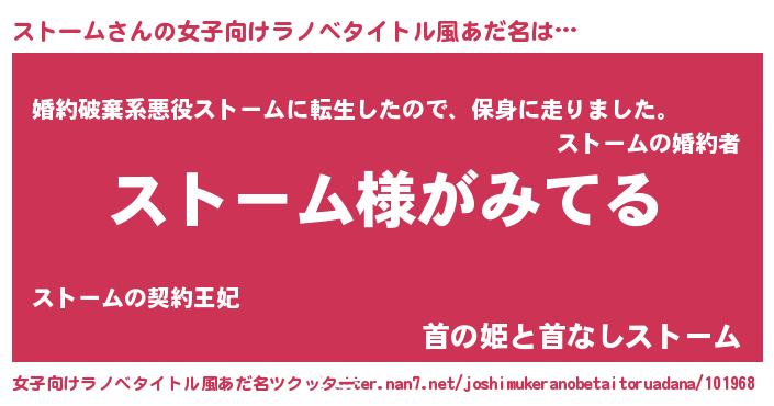 | 男性向けラノベタイトル風あだ名 | 『ストームの嫁は女の子じゃないと思った?』 |