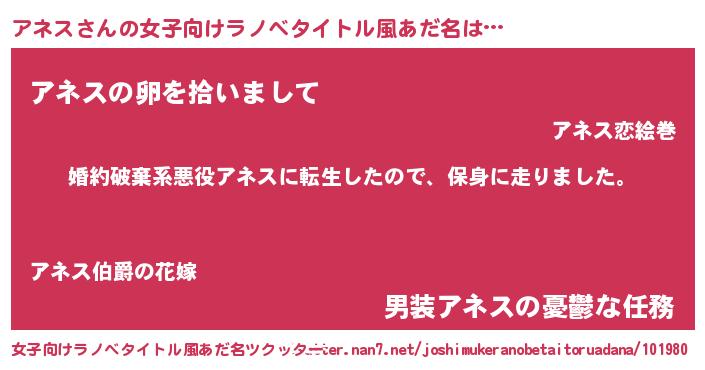 | 男性向けラノベタイトル風あだ名 | 『アネススレイヤー』 |