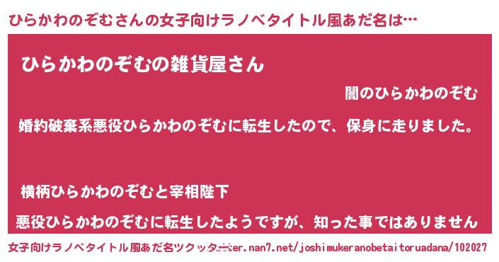 | 男性向けラノベタイトル風あだ名 | 『転生したらひらかわのぞむだった件』 |
