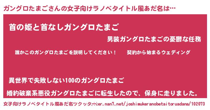 | 男性向けラノベタイトル風あだ名 | 『ガングロタマゴアートオンライン』 |