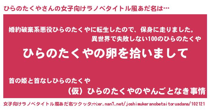 | 男性向けラノベタイトル風あだ名 | 『ひらのたくやの嫁は女の子じゃないと思った?』 |