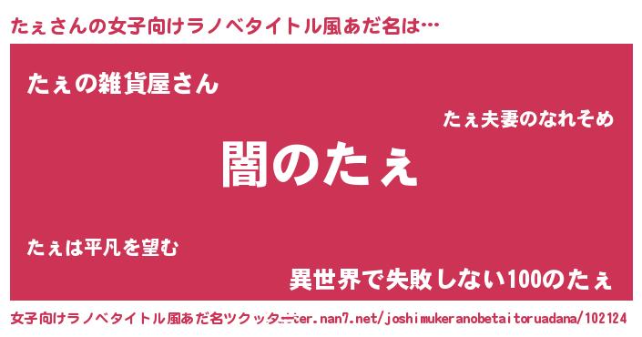 | 男性向けラノベタイトル風あだ名 | 『Re:たぇから始める異世界生活』 |