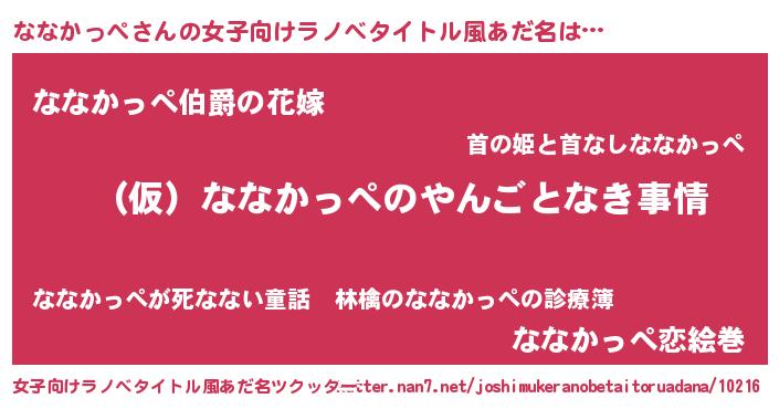 | 男性向けラノベタイトル風あだ名 | 『ななかっぺの憂鬱』 |