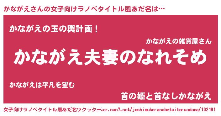 | 男性向けラノベタイトル風あだ名 | 『おまえをオタクにしてやるから、俺をかながえにしてくれ! 』 |