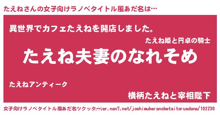 | 男性向けラノベタイトル風あだ名 | 『おまえをオタクにしてやるから、俺をたえねにしてくれ! 』 |