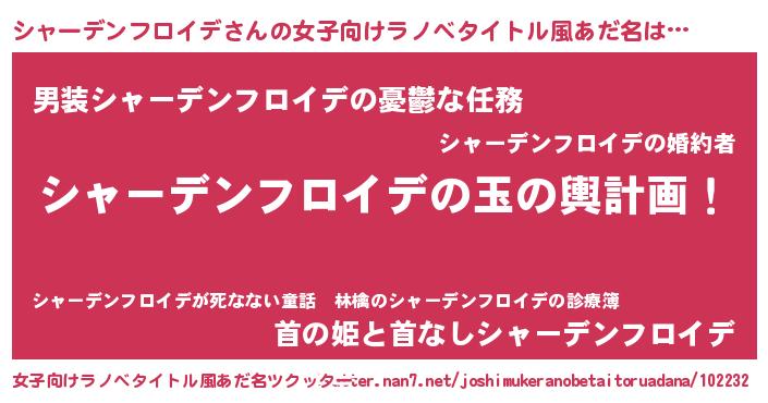| 男性向けラノベタイトル風あだ名 | 『シャーデンフロイデ~年齢イコール彼女いない歴の魔法使い~』 |