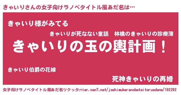 | 男性向けラノベタイトル風あだ名 | 『きゃいり~年齢イコール彼女いない歴の魔法使い~』 |
