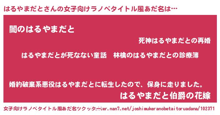 | 男性向けラノベタイトル風あだ名 | 『魔弾の王とはるやまだと』 |