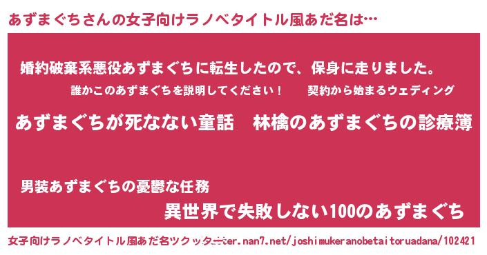 | 男性向けラノベタイトル風あだ名 | 『魔弾の王とあずまぐち』 |