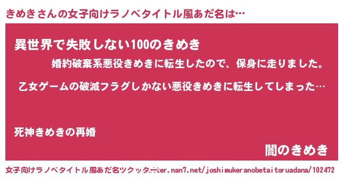 | 男性向けラノベタイトル風あだ名 | 『魔弾の王ときめき』『キメキスレイヤー』 |