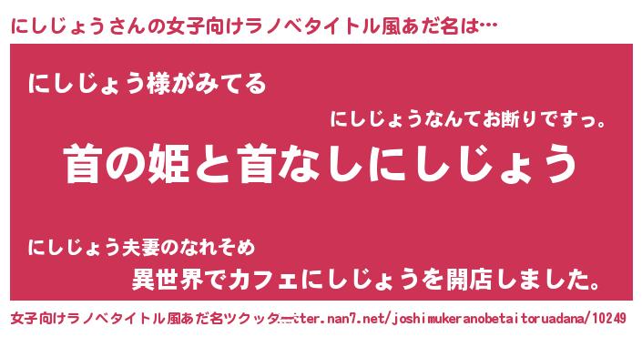 にしじょうさんの女子向けラノベタイトル風あだ名は… 『首の姫と首なしにしじょう』『にしじょう様がみてる』『異世界でカフェにしじょうを開店しました。』 ツクッター #女子向けラノベタイトル風あだ名ツクッター http://tkutter.nan7.net/joshimukeranobetaitoruadana/10249/