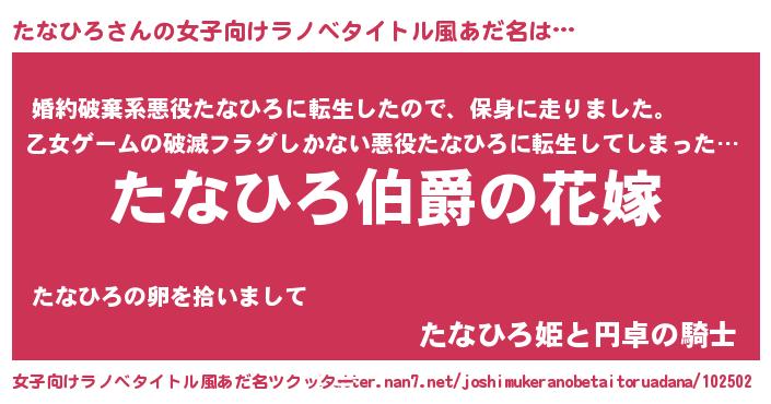 | 男性向けラノベタイトル風あだ名 | 『うちの娘の為ならば、俺はもしかしたらたなひろも倒せるかもしれない。』 |
