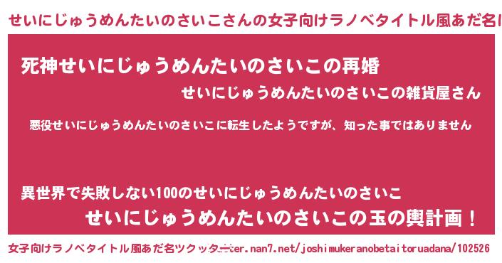 | 男性向けラノベタイトル風あだ名 | 『この素晴らしい世界にせいにじゅうめんたいのさいこを!』 |