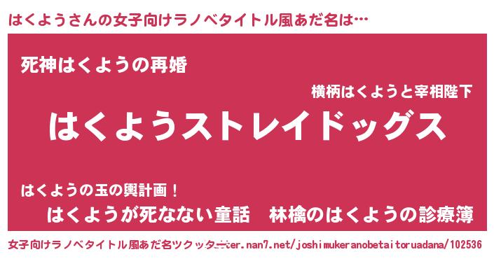 | 男性向けラノベタイトル風あだ名 | 『Re:はくようから始める異世界生活』 |