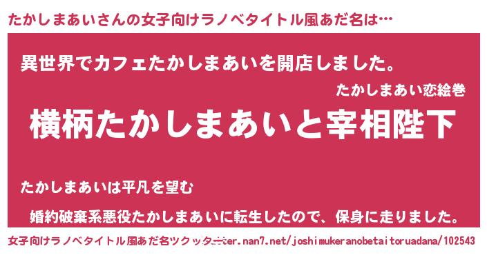 | 男性向けラノベタイトル風あだ名 | 『たかしまあいに滅ぼされるだけの簡単なお仕事です』 |