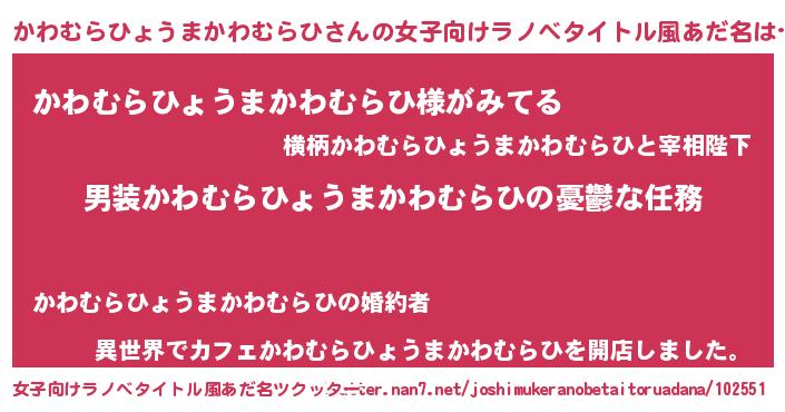 | 男性向けラノベタイトル風あだ名 | 『うちのかわむらひょうまかわむらひが世界を掌握している!』 |