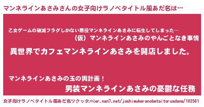 | 男性向けラノベタイトル風あだ名 | 『誰もが恐れるあのマンネラインあさみが、ぼくの専属メイドになるようです。』 |