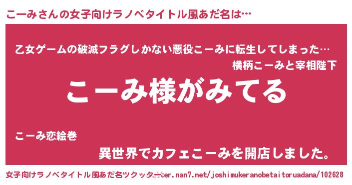 こーみさんの女子向けラノベタイトル風あだ名は… 『こーみ様がみてる』『乙女ゲームの破滅フラグしかない悪役こーみに転生してしまった…』『異世界でカフェこーみを開店しました。』 ツクッター #女子向けラノベタイトル風あだ名ツクッター http://tkutter.nan7.net/joshimukeranobetaitoruadana/102628/