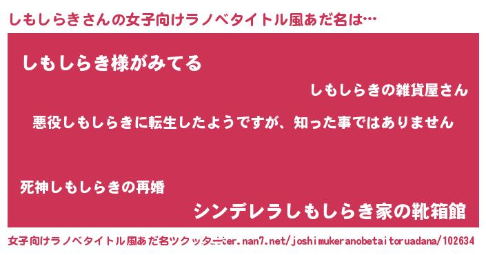 | 男性向けラノベタイトル風あだ名 | 『この素晴らしい世界にしもしらきを!』 |
