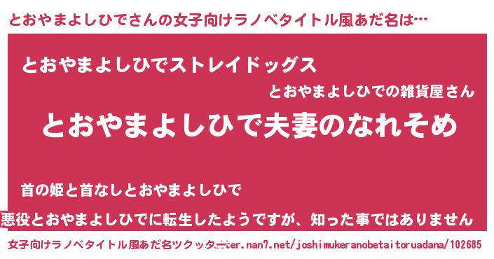 | 男性向けラノベタイトル風あだ名 | 『おまえをオタクにしてやるから、俺をとおやまよしひでにしてくれ! 』 |