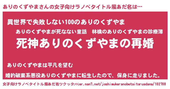 | 男性向けラノベタイトル風あだ名 | 『ノーゲーム・ノーアリノクズヤマ』 |