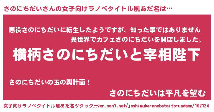 | 男性向けラノベタイトル風あだ名 | 『さのにちだいに滅ぼされるだけの簡単なお仕事です』 |