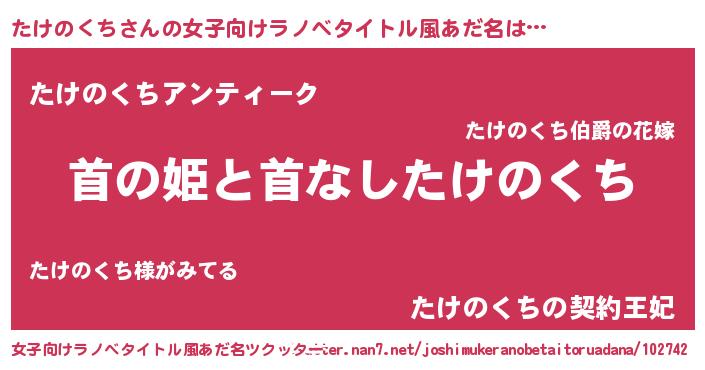 たけのくちさんの女子向けラノベタイトル風あだ名は… 『首の姫と首なしたけのくち』『たけのくちアンティーク』『たけのくちの契約王妃』 ツクッター #女子向けラノベタイトル風あだ名ツクッター http://tkutter.nan7.net/joshimukeranobetaitoruadana/102742/