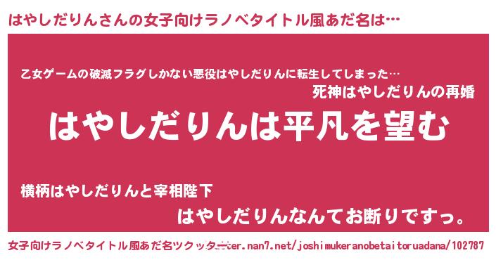 | 男性向けラノベタイトル風あだ名 | 『ダンジョンにはやしだりんを求めるのは間違っているだろうか』 |