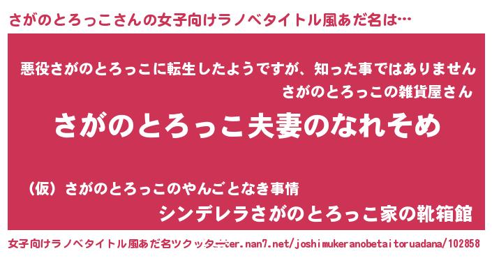 | 男性向けラノベタイトル風あだ名 | 『おまえをオタクにしてやるから、俺をさがのとろっこにしてくれ! 』 |