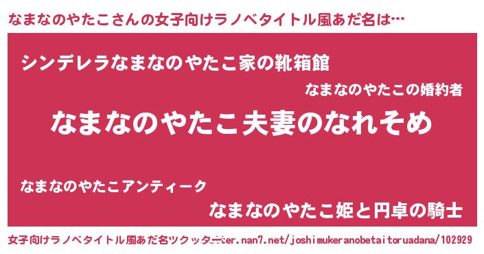 | 男性向けラノベタイトル風あだ名 | 『おまえをオタクにしてやるから、俺をなまなのやたこにしてくれ! 』 |