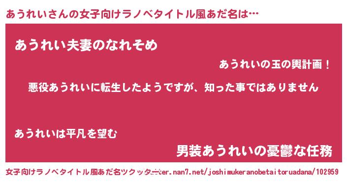 | 男性向けラノベタイトル風あだ名 | 『この素晴らしい世界にあうれいを!』 |