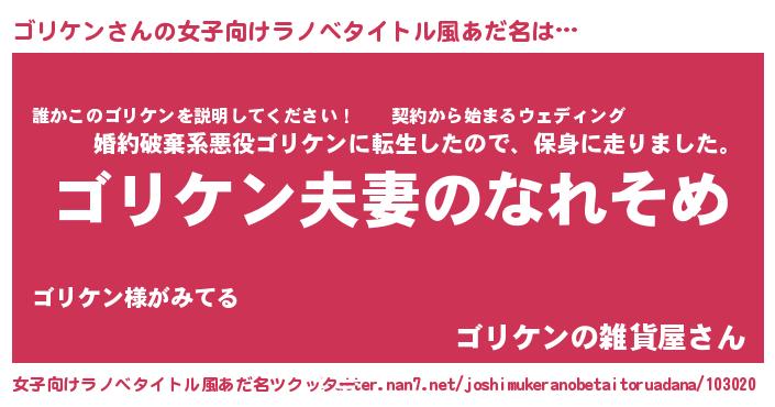 | 男性向けラノベタイトル風あだ名 | 『おまえをオタクにしてやるから、俺をゴリケンにしてくれ! 』 |