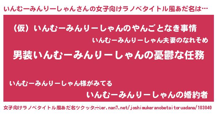 | 男性向けラノベタイトル風あだ名 | 『うちのいんむーみんりーしゃんが世界を掌握している!』 |