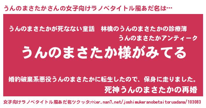 | 男性向けラノベタイトル風あだ名 | 『うんのまさたかの嫁は女の子じゃないと思った?』 |