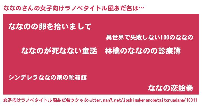 ななのさんの女子向けラノベタイトル風あだ名は… 『ななのが死なない童話 林檎のななのの診療簿』『ななのの卵を拾いまして』『ななの恋絵巻』 ツクッター #女子向けラノベタイトル風あだ名ツクッター http://tkutter.nan7.net/joshimukeranobetaitoruadana/10311/