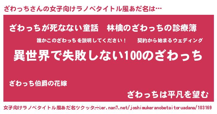 | 男性向けラノベタイトル風あだ名 | 『ざわっちという概念が存在しない退屈な世界 』 |