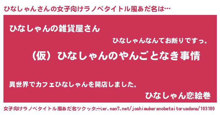 | 男性向けラノベタイトル風あだ名 | 『ひなしゃんの憂鬱』 |