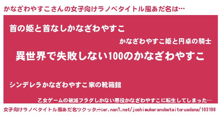 | 男性向けラノベタイトル風あだ名 | 『かなざわやすこという概念が存在しない退屈な世界 』 |