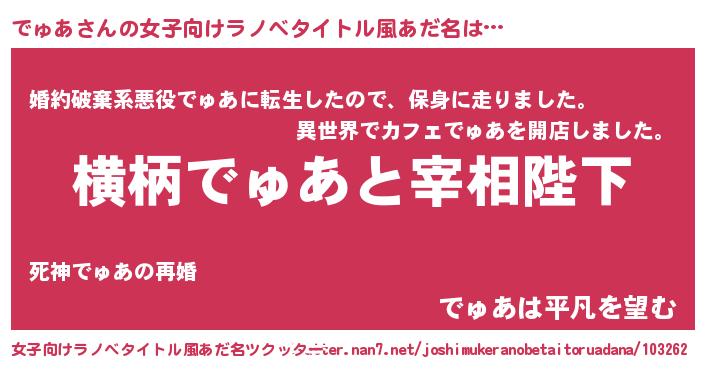 | 男性向けラノベタイトル風あだ名 | 『でゅあに滅ぼされるだけの簡単なお仕事です』 |
